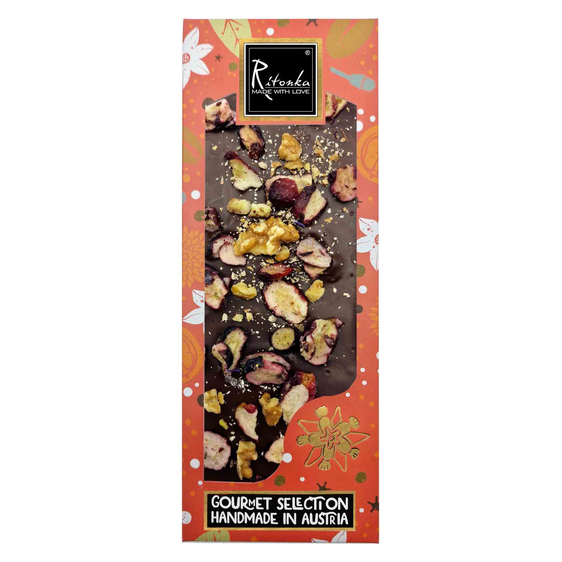 Handmade in Austria with specially selected fruits in a beautiful packaging. Ritonka Gourmet Selection dark chocolate with grapes,¨and walnut. Net weight: 130g
