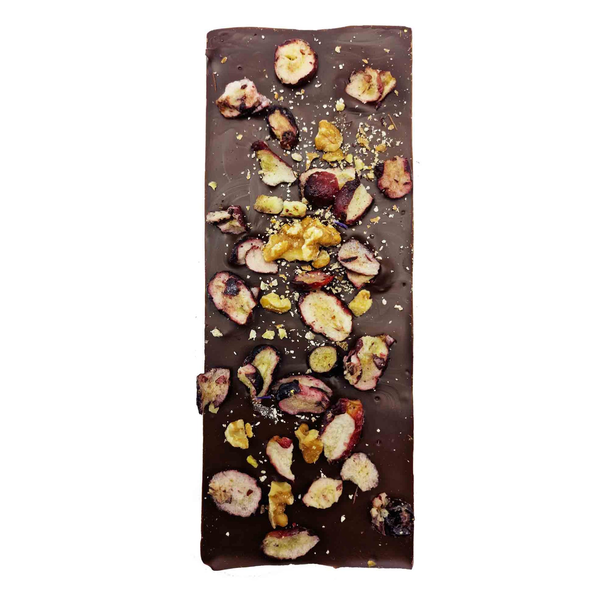 Bitter chocolate (cocoa mass, sugar, cocoa butter, emulsifier: soy lecithin, bourbon vanilla), freeze-dried grapes 2%, walnuts 0.5%.
