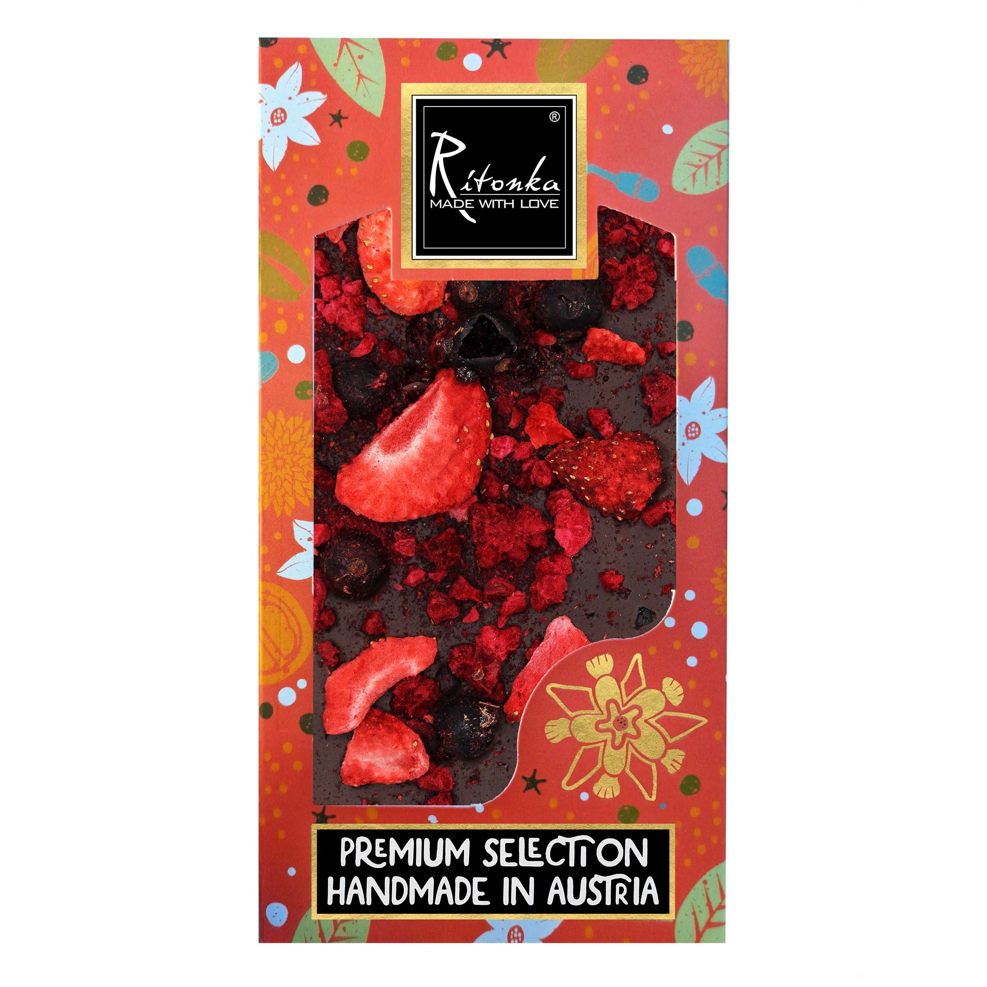 Handmade Ritonka dark chocolate - berry mix with 65% cocoa content. The dark bitter chocolate has a wonderful aroma and a delicate hint of flowers. The perfect duo is created from cocoa beans from West Africa, refined with aromatic berries. Dark chocolate goes wonderfully with strong wine.Nutritional information is subject to raw material and production-related fluctuations.May contain traces of milk and nuts.Store in a dry place, protected from light, preferably at a temperature from 12-20 °C.