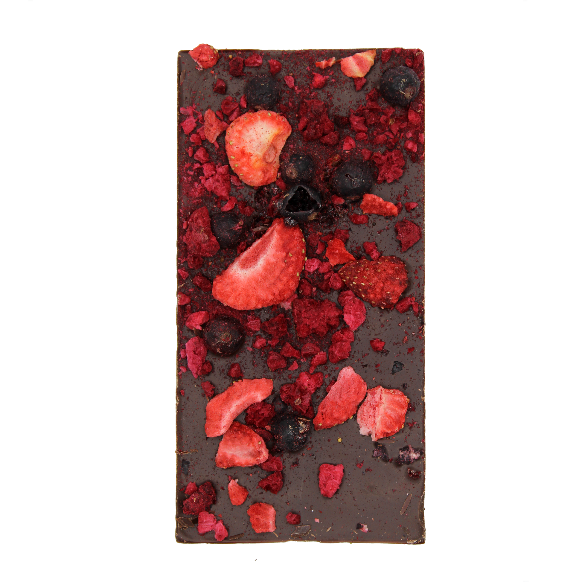 Bitter chocolate (cocoa mass, sugar, cocoa butter, emulsifier: soy lecithin, bourbon vanilla), freeze-dried blackcurrant 3%, freeze-dried raspberry 2.35%, freeze-dried strawberry 2%. Cocoa at least 65%.