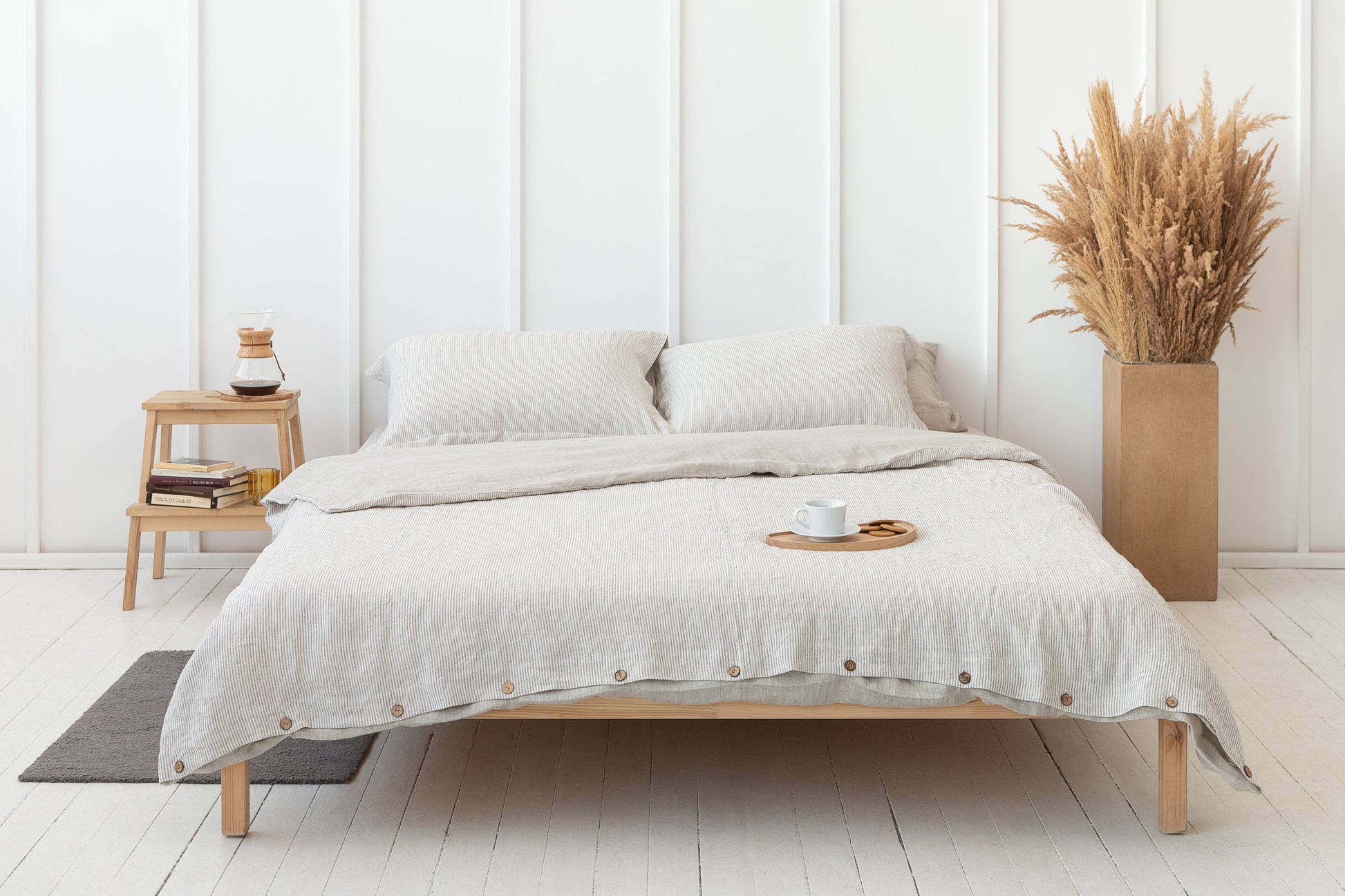 Two-sided bedding set in natural light and striped beige color from softened stonewashed linen is designed to make your bedroom elegant and beautiful, same time providing you with the best night's sleep. With this new reversible bedding, you can decorate your room according to your mood easily. It will help you easily create a minimal, Scandinavian look in your bedroom and help you enjoy restful nights. The items are made with special coconut buttons closure, which makes it a nice detail in this set.